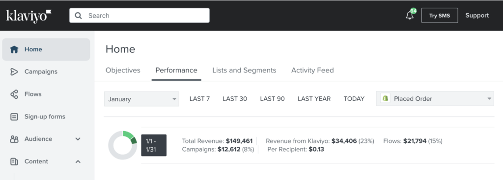 The screenshot below is from the client’s actual Klaviyo account at the close of the 30-day period. Flows and campaigns running together, each pulling their weight.