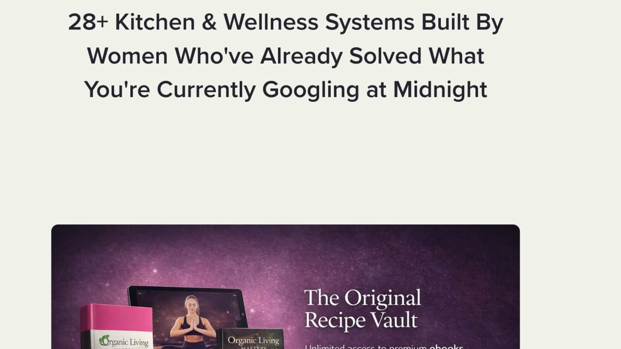 The vault needed to serve a broad audience — women dealing with ADHD kids, diabetes management, budget cooking, pregnancy nutrition, gut health, and fitness — without feeling scattered. That’s hard to pull off with 28 products on one storefront.